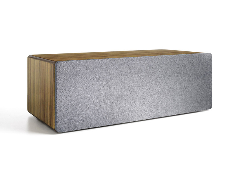Available in black ash, walnut, or zebrawood, the rectangular, 4-by-12-by-5.3-inch (HWD), 10-pound B2 features a gray speaker grille that magnetically snaps on and off. When on, the speaker has a very simple, refined, uniform look. When the grille is off, the two woofers and two tweeters are revealed to make the speaker look more like a piece of serious hi-fi gear.