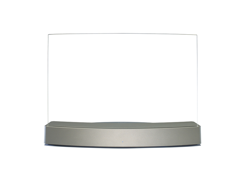 Available in silver, charcoal, or dark bronze, the Clio measures 9.3 by 12.7 by 3.8 inches (HWD) and weighs just shy of two pounds. The transparent panel that dominates the speaker curves gently above the base that houses the actuators and down-firing 2-inch woofer.