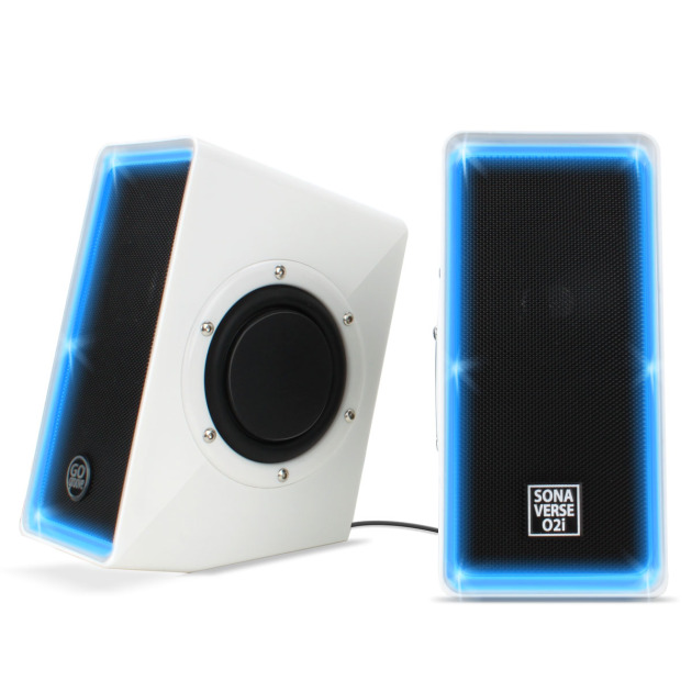 The SonaVerse O2i consists of a pair of white plastic speakers with prominent blue LED lighting surrounding each front-facing black grille. Each enclosure measures 5.8 by 4.4 by 2.7 inches (HWD), and the set weighs 2.5 pounds. The black plastic grilles are roughly textured, and a single front-loaded 2-inch paper cone driver peaks out from behind each one. The passive radiators are also made of paper, but have some serious excursion, which hints at decent bass response. The left speaker has a GoGroove logo, while the right speaker has a SonaVerse O2i logo; at least it’s easy to tell which is left and which is right.