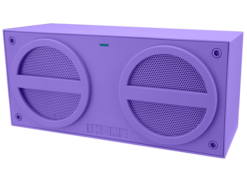 The 7-by-8.4-by-2.5-inch (HWD) frame of the rectangular, 1.2-pound iBN24($37.41 at Amazon)(Opens in a new window) comes in dark gray, yellowish green, or purple. Along the front face, two small drivers sit behind plastic mesh grilles that are the same color as the rest of the body. The iHome logo itself looks pretty cool—it’s an interesting font they’ve chosen to use for the iBN24, and it’s etched into the front and back panels. Along the back, we have bass ports to move air from the speakers, and some decent connectivity: a 3.5mm aux input, (a cable is included), the micro USB connection point for charging (a USB cable is included), a Power switch, the Bluetooth power button, and the 3.5mm Aux output, should you want to send the audio to another speaker. (Quite possible you will want to do that, but you might just cut out the middleman and go to the other speaker directly.)