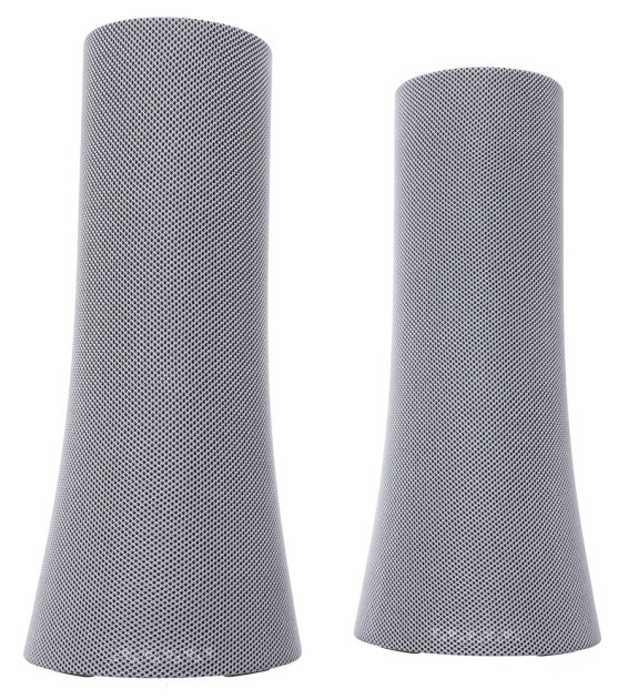 The Z600 is simple and elegant, looking more like slightly curved, white vases with gray fabric grilles, than desktop speakers. They’re neutral enough to go with your iMac or your PC, though a black version would have been nice too. A white strip runs up the length of the satellite from the audio cable connection. On the right speaker the white strip holds the Bluetooth and power buttons and, behind a rubber door, an 3.5mm auxiliary input.