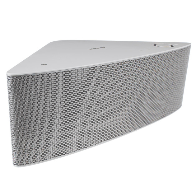 The M7 looks like a big Trivial Pursuit wedge. It’s a big, blocky, 15.8-inch-wide and 5.3-inch-tall triangle weighing 8.6 pounds and available in black or white versions. The black model has a black grille, and the white version has a silver grille. The top panel of the speaker holds an array of touch-sensitive controls, including a volume control disc, a Mute button, and individual source buttons for Wi-Fi, Bluetooth, and TVConnect for automatically syncing it with compatible Samsung HDTVs.