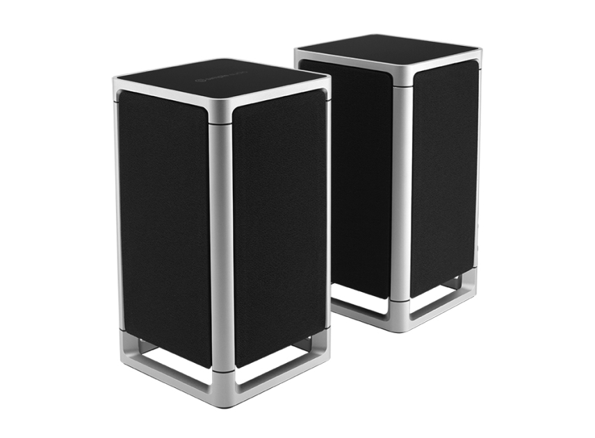 You wouldn’t accuse the Listen speaker pair of being ugly, but it’s not necessarily an eye-catching design. Measuring 7.9 by 4.3 by 4.3 inches (HWD), each Listen speaker has metallic borders running from the built-in stands up each corner to the top panel, which is a glossy black plastic surface. The side panels are covered in black grille cloth on all four sides, hiding a 1-inch tweeter and a 3-inch woofer on each speaker. The speakers are bi-amplified, so each driver receives its own amplifier as well.