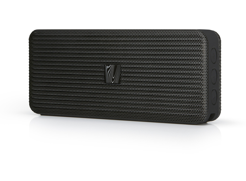 The rectangular Pocket Kick, available in black, platinum, or gold, measures 2.5 by 5.9 by 1.2 inches (HWD) and is better suited for throwing in a small bag or tote than sticking in a pocket. Stylized metallic grilles cover the front and back panels, which respectively hide two 2.5-watt drivers and a passive bass radiator.