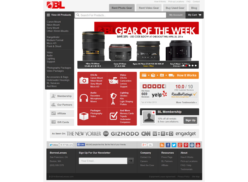 BorrowLenses breaks its rental library down two main lines—photo gear and video gear—and also features a used gear shop and a blog. Photo equipment for all major camera systems, both SLR and mirrorless, is available, as are a few fixed-lens compact cameras. Lenses and cameras are classified by mount, but organization could be improved. It’s easy enough to find rental options for Nikon and Canon lenses and cameras—they have direct links and there are filters up top to select lenses (wide angle, standard, telephoto, macro and tilt-shift, and a few others), bodies, flashes, and other accessories.