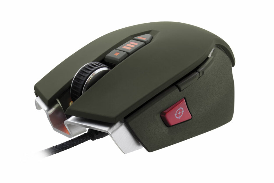 The FPS-friendly Vengeance M65 features a Sniper button for instant switching between fast-moving high-DPI settings and tight low-DPI settings better suited to precision sniping. The aluminum unibody frame also has an adjustable center of gravity for balancing the mouse to individual preference. The Vengeance M65 comes in three colors, Military Green, Arctic White, and Gunmetal Black.