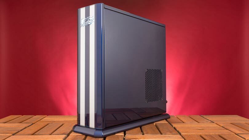 Falcon Northwest consistently puts out some of the nicest-looking high-end desktops, usually leaning toward a minimalist approach and premium automotive paint. This was the case with the 2015 Tiki and the more recent Talon , and so it is again here. The company offers customizable paint jobs (ours added $424 to the cost), and the all-metal 2017 Tiki unit we received boasts a navy blue base with two metallic gray vertical stripes running along the front and top panels. It’s pretty slick, resembling the iconic hood of a Mustang GT350. The left side features a window perfectly sized and positioned to let you look in at the GTX 1080. Given that Nvidia’s newest cards are futuristic looking in their own right, it’s a nice touch of flair to an overall restrained design.