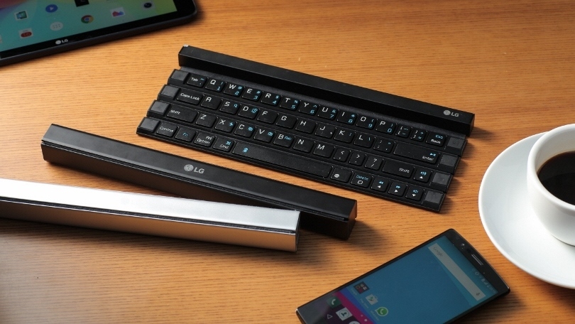 LG’s new portable keyboard folds up around a spine to become a sort of wand, or a small nightstick. When you unroll it, it has four rows of very acceptably sized keys separated by little moats. A stand snaps out of the back to hold a 10-inch tablet. As a generic Bluetooth keyboard, it’ll work with Android, Apple, or Windows tablets.