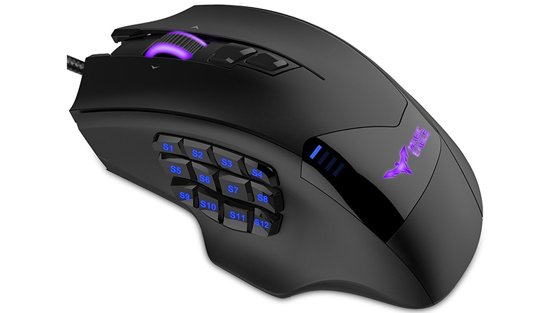 Plug in the mouse and it becomes more daring, with colorful, cycling lights that set off the “Magic Eagle” logo and limn the edges of the scroll wheel. This also calls attention to the HV-MS735’s most dynamic feature, the 12 buttons on the left edge near where your thumb rests while in use, which glow in a solid blue. (Perhaps it goes without saying, but this mouse is for right-handed users only.) Bringing the total number of buttons to 19, this definitely brands the mouse as one for hard-core MMO players who may need or want to assign plenty of functions that can be accessed with a single, split-second click.