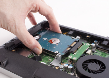 Just as SO-DIMMs are considerably smaller than the full-size DIMMs used in desktops, they also need to be installed in a slightly different way. Locate the memory bays just above and to the right of the hard drive, as shown in the photo. Working with the one closest to the CPU fan and heat sink, line up the notch in the SO-DIMM with the key in the bay and push the chip in. It will not automatically lie flat, but instead protrude at a diagonal angle. Once the memory is in that position, push down on it gently until it clicks into place on both sides.