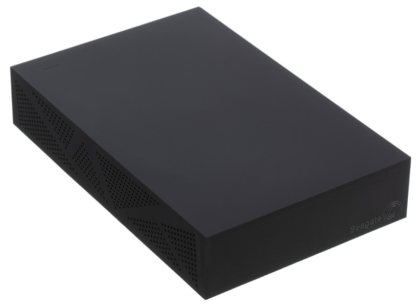 The chassis is made of black polycarbonate, with perforations on three faces for cooling. The front has the Seagate logo molded into a corner, while the back has a USB 3.0 port and the jack for the included AC adapter. The desktop-class drive measures about 1.75 by 4.75 by 7 inches (HWD), and multiple units can be stacked upon another on their rubber feet. The bottom panel is faceted, like the surface of a gem, and is also perforated for cooling.