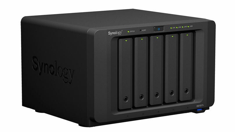 The feature-rich Synology DiskStation DS1517+ is a five-bay network-attached storage (NAS) device that is easy to manage, offers multiple RAID configurations, and supports numerous apps.