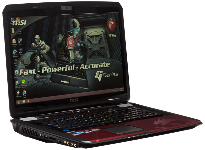 More than a full terabyte of data storage is available, thanks to the combination of a 750GB 7,400 rpm hard drive and two 128GB solid-state drives (SSD) in RAID 0 (striped) array. The combination makes for a sizable amount of storage and optimum performance. MSI doesn’t put any needless software onto its new systems, just the Windows 8 (64-bit) operating system and a few tools for backup and calibration, so the new GT70 One Dragon Edition has nearly all of that storage space available right out of the box.