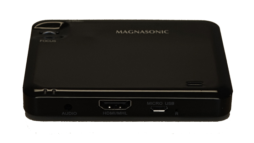 The handsomely designed Pico Video Projector is glossy black with rounded corners, measures 0.5 by 3.8 by 3.9 inches, and weighs 4.5 ounces. This ultra-thin device can easily fit in a shirt pocket. It has a built-in, rechargeable 2,100mAh battery that, according to Magnasonic, should last about two hours on a charge, a claim that was borne out in our testing. The projector comes with a small, foldable plastic tripod. As is typical of a small LED projector, it lacks a zoom. Behind the lens is a tiny focus wheel, which requires some effort to use effectively.