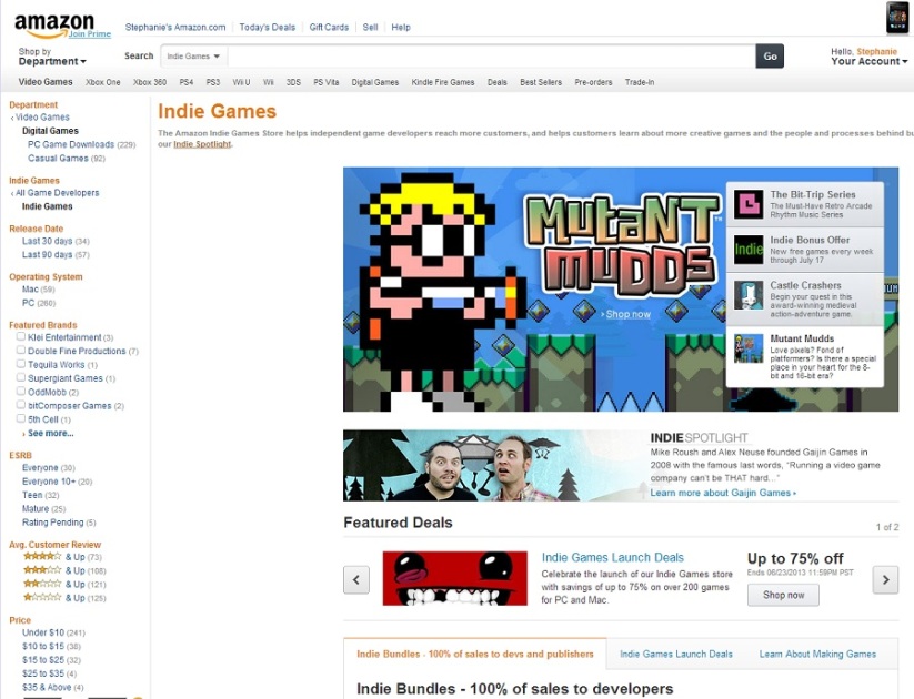 Amazon is celebrating the store’s launch with promotions encouraging customers to engage with the indie game scene. Once a week, the company will host the Indie Spotlight, with developer Q&A sessions and featured bios to provide customers with an inside look at each developer’s style and personality. The series begins today with Gaijin Games.