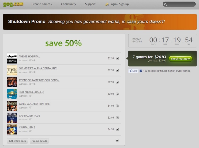 GOG is hosting a special one-day “Shutdown Promo(Opens in a new window),” offering seven games for a discounted $24.93 half off of the entire bundle’s original price. The offer lasts until Thursday at 8 a.m. Eastern.