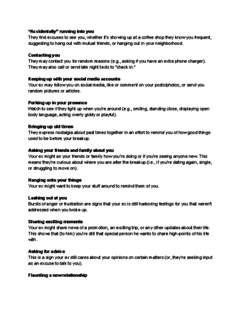 Your ex will probably try to find reasons to be around you if they’re still interested. They might pop up at your job, hang out at your favorite places, and attend events they know you enjoy. Track how often you see your ex to figure out if they might be trying to run into you.[2] X Research source