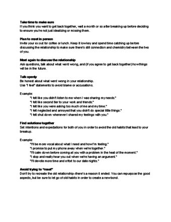 Don’t be too quick to jump back into the relationship. Sometimes, you idealize the things you no longer have. Don’t forget why you broke up. If you’re only going to jump back into the same problems, then steer clear of your ex.
