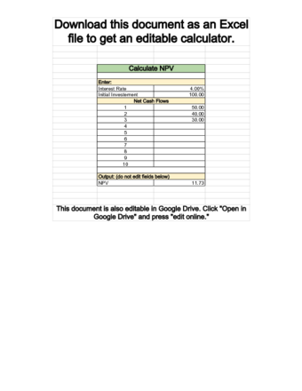 NPV can also be calculated using a financial calculator or a set of NPV tables, which are useful if you don’t have a calculator to perform the cash flow discounts.⧼thumbs_response⧽