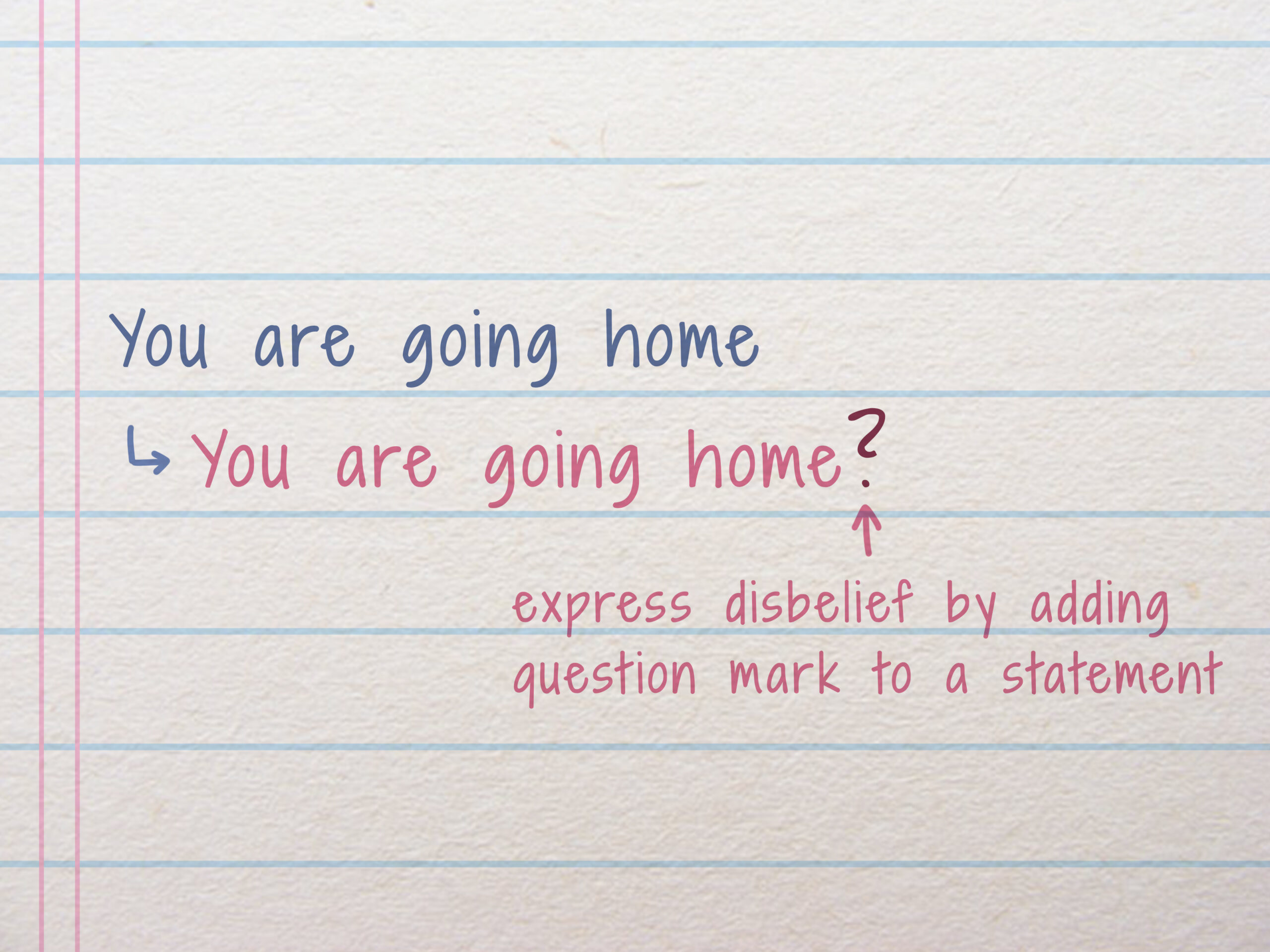 3Add a question mark to a statement to express disbelief. Adding a question mark at the end of a statement instantly turns it into a question. Change the period to a question mark when you are confused about what is happening. Typically, these questions have a “yes” or “no” answer. Here are some examples:[12]