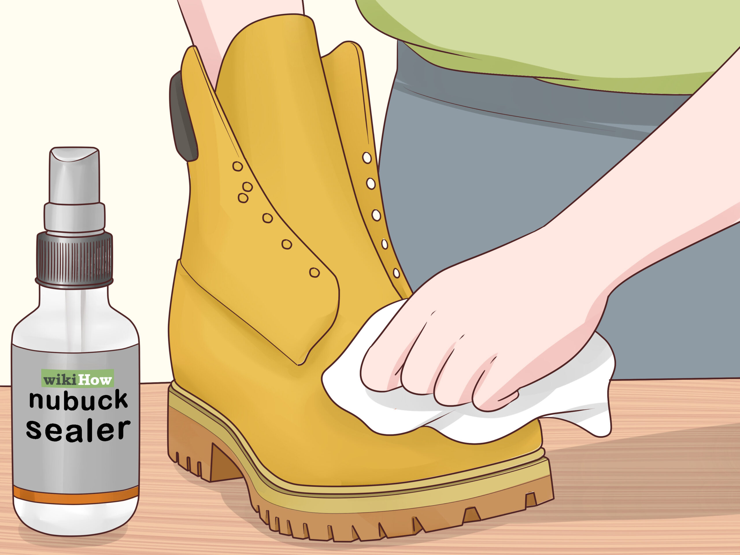 1Purchase nubuck cleaning and sealing products that match your boots. The products you use should be designed for your boots’ specific fabric. Timberland boots come in suede and leather styles, but the traditional Timberland boot is make of nubuck. Suede and nubuck can typically be cleaned with the same cleaner.- Make sure to buy leather cleaning supplies that match the color of your leather. Look on the packaging of a potential product and make sure that it can clean the yellow leather that a Timberland boot is usually made of.