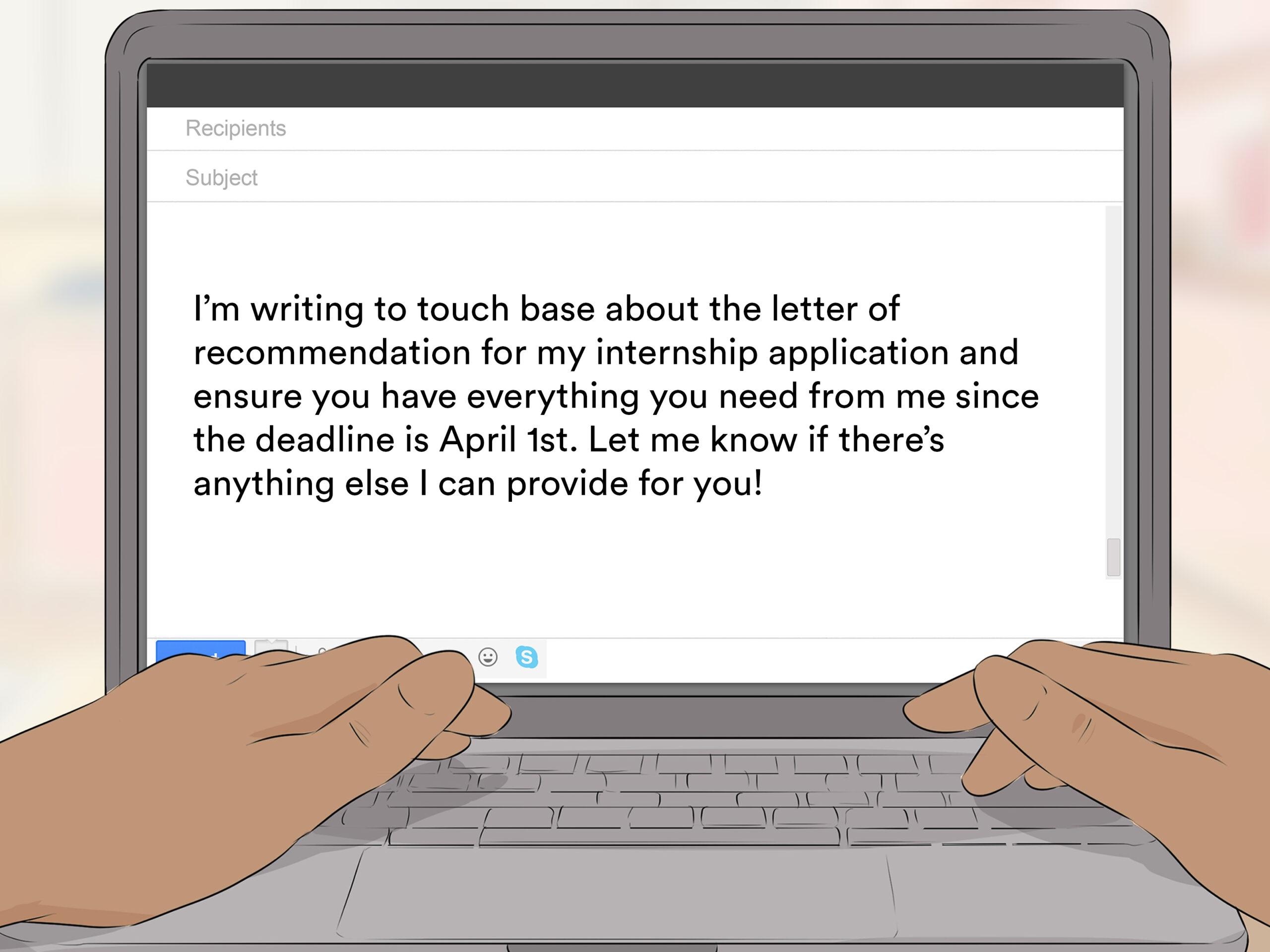 “I’m writing to touch base about the letter of recommendation for my internship application and ensure you have everything you need from me since the deadline is April 1st. Let me know if there’s anything else I can provide for you!”