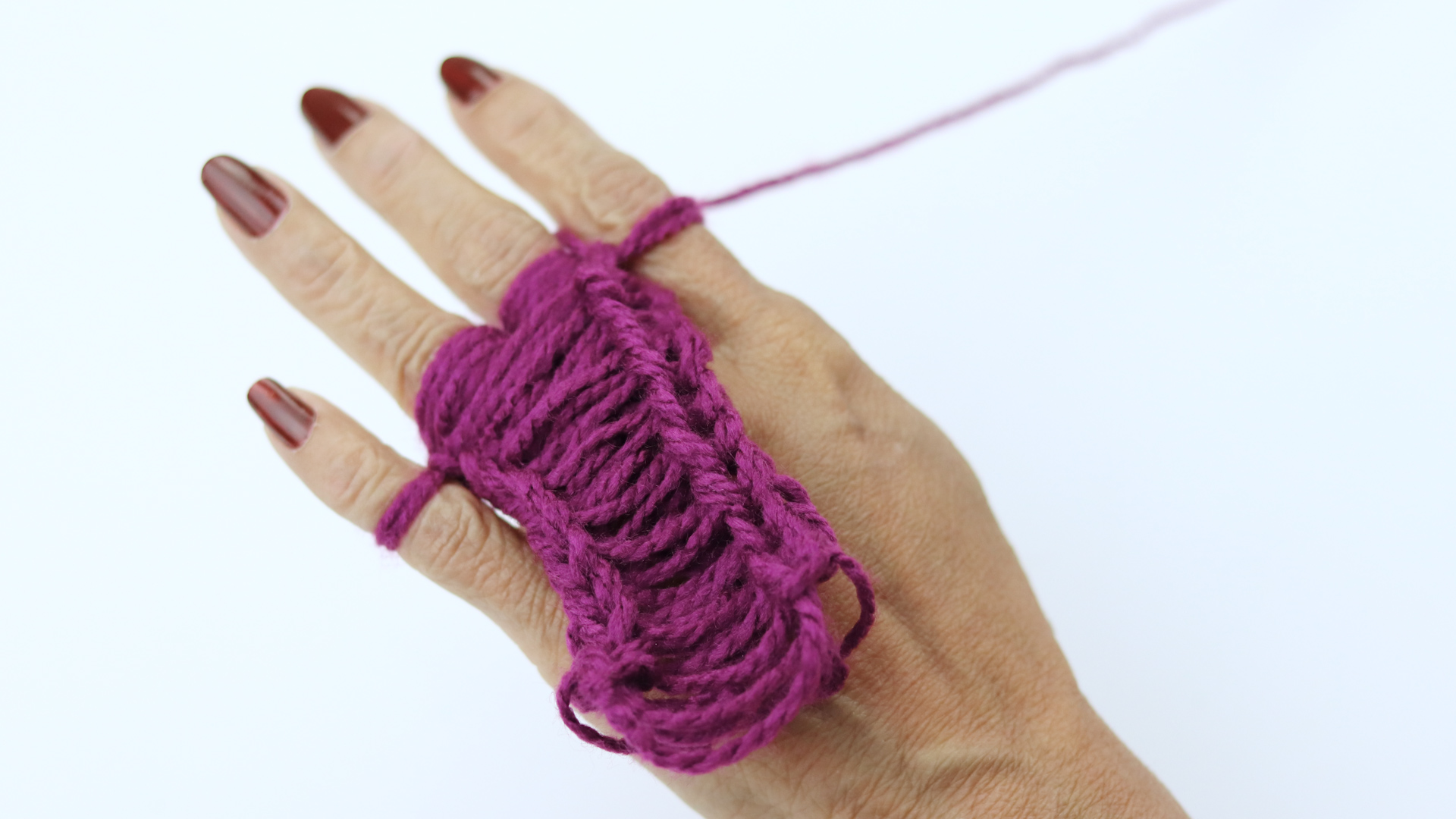Repeat repositioning of the yarn. Once again use your dominant (free) hand to slightly push the yarn down so that the remaining loops are closer to the bottom of your fingers, allowing additional room to continue the weave.