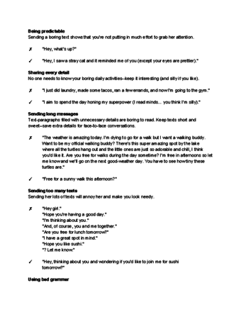 Don’t be boring and predictable. The worst text flirting crime you can commit is to be boring and predictable. Your text messages should be fun and interesting. If you can’t think of anything fun or interesting to say, then you probably shouldn’t text her at all.[1]