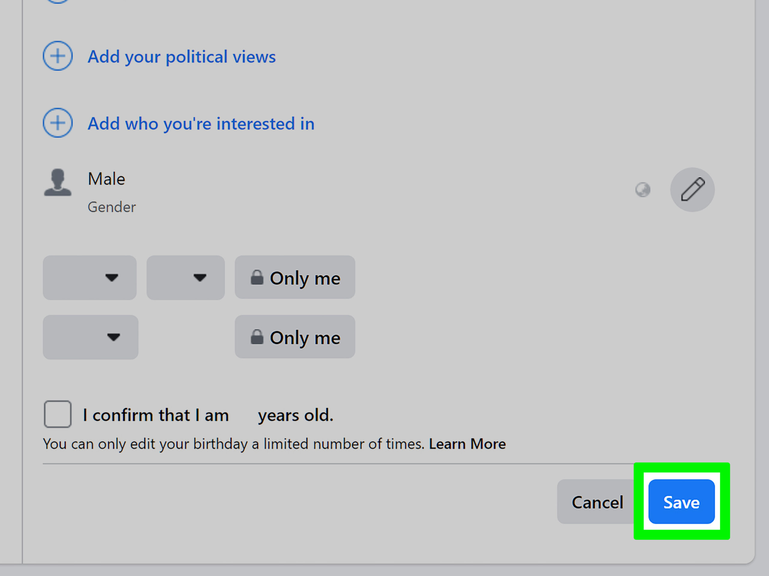 Make your age/birth year private (optional). If you also want to hide your age from your profile, click the privacy menu next to your birth year and select Only me (or Friends, to make it friends-only).
