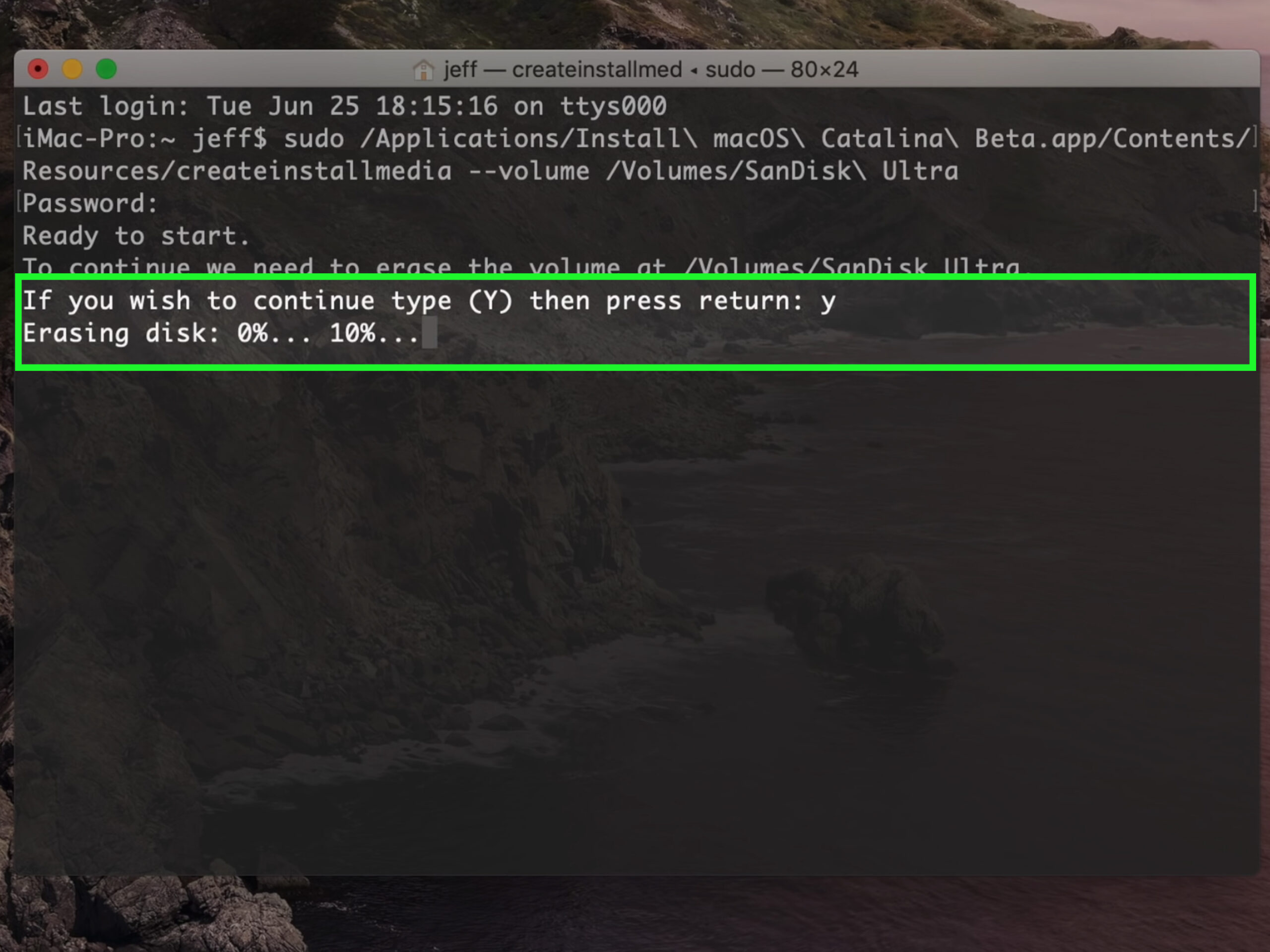 6Press the y key to confirm and then press ⏎ Return. This creates an image of the installation files on the USB drive. When the process is complete, you’ll see the word “Done” and return to the prompt. This means you can eject the drive and use it to boot this or another Mac.
