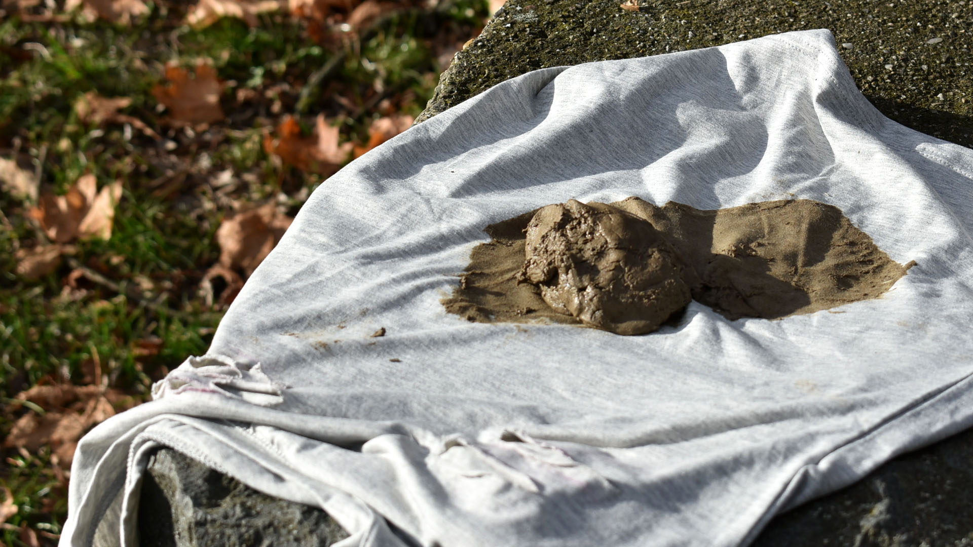 Put the lumpy clay mixture into a piece of fabric to dry for 2 days. Lay out a big piece of fabric, like an old t-shirt. Then, pour the clay mixture onto the fabric, being careful not to lose any. Quickly wrap the fabric around the clay to trap it inside. Hang the fabric up outside so that the water can drip out of the fabric. [34]