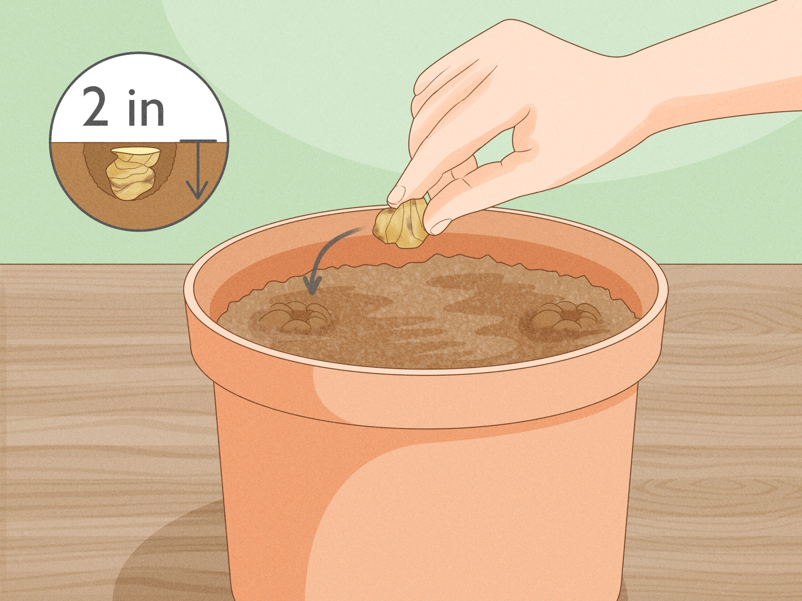 Then, fill the pot with the soil, leaving about 1 inch (2.5Â cm) of space at the top, and plant the ginger 2 inches (5.1Â cm) beneath the surface, laid horizontally.[4]