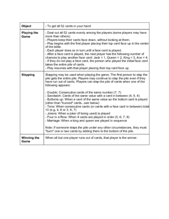 • If you have no cards and you slap at the wrong time, then you are out of the game for good (unless you are playing by modified rules, such as allowing players to lend cards to each other).
