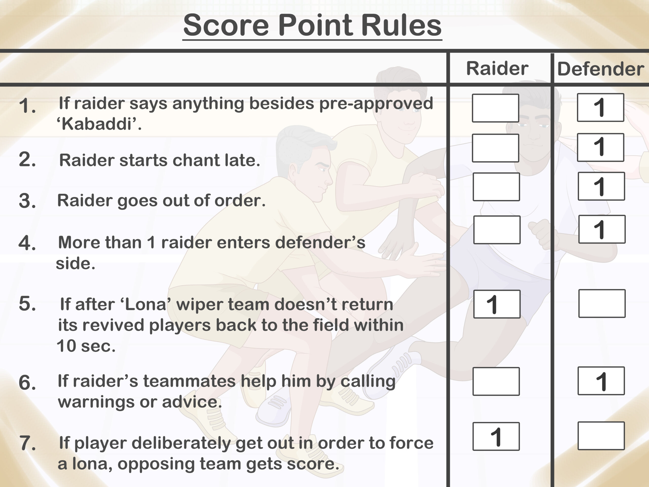 • The goal of defenders in Kabaddi is to capture the raider — not hurt him. Deliberately rough play is grounds for ejection from the game and/or suspension.