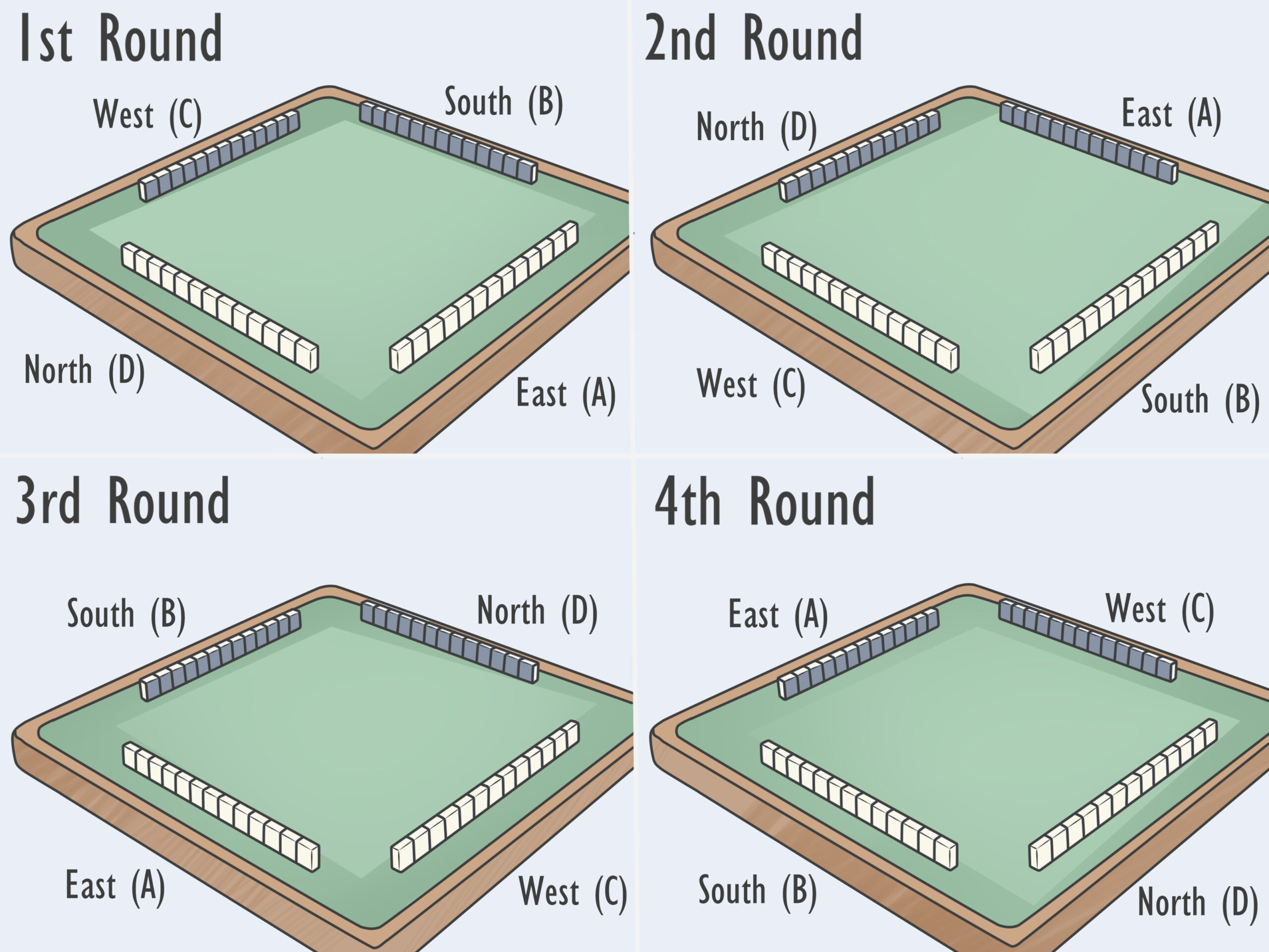 • The person to the right of the East Wind, the South Wind, goes first.[6]