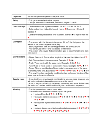 - A run or sequence requires at least three cards in numerical order. ( The suits can be mixed.) It can only be beaten by another sequence where the rank of the highest card is ranked higher than the last card in the previous run. The lowest card a run can begin with is a 3 of spades For instance, a 4 of spades, 5 of hearts, 6 of diamonds and 7 of spades is beaten by a 4 of hearts, 5 of diamonds, 6 of hearts and 7 of hearts because a 7 of hearts is higher than a 7 of spades.