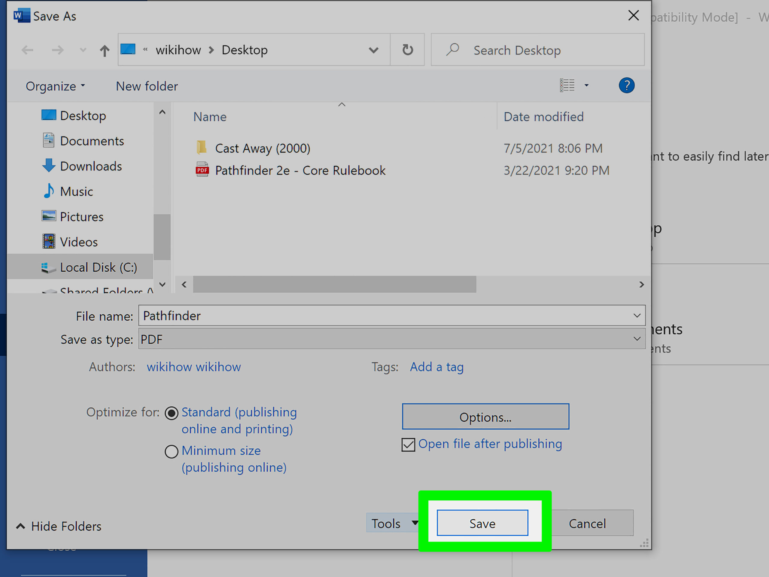 Select PDF as the file format. Depending on your version of Word, the file type menu may be in the upper-right corner of the page, or in the “Save as type” menu toward the bottom.