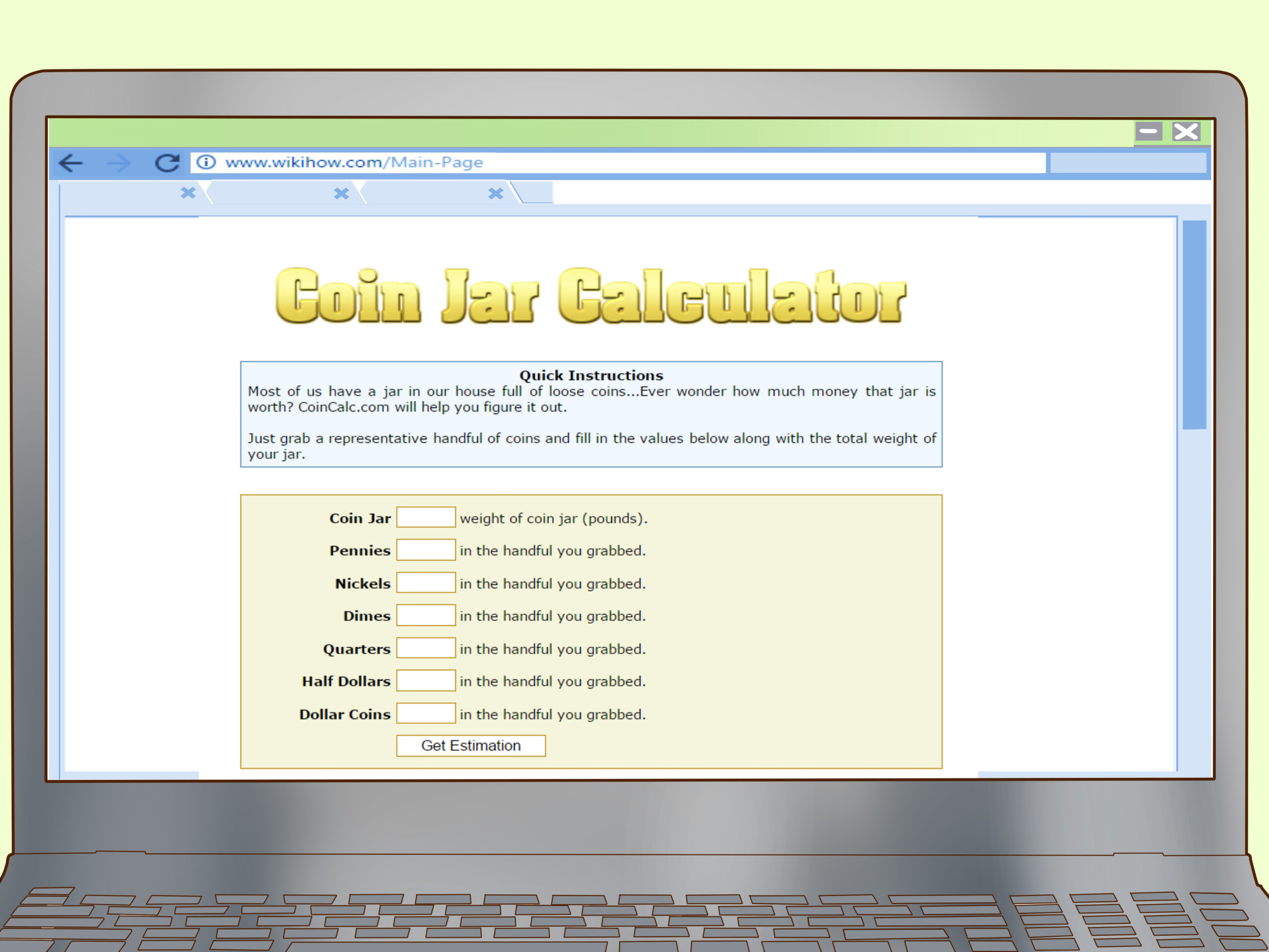 3Measure your change collection’s value by weight. Because coins are minted with a precise size and composition of metals, each one weighs a certain, predictable amount. You can estimate the value of a mixed coin collection using CoinCalc.com or for U.S. coinage, or separate them by type and weight them for a more accurate result:- One pound of quarters is worth $20. One pound of dimes is worth $20. One pound of nickels is worth about $4.50, and one pound of pennies is worth about $1.80.[9]