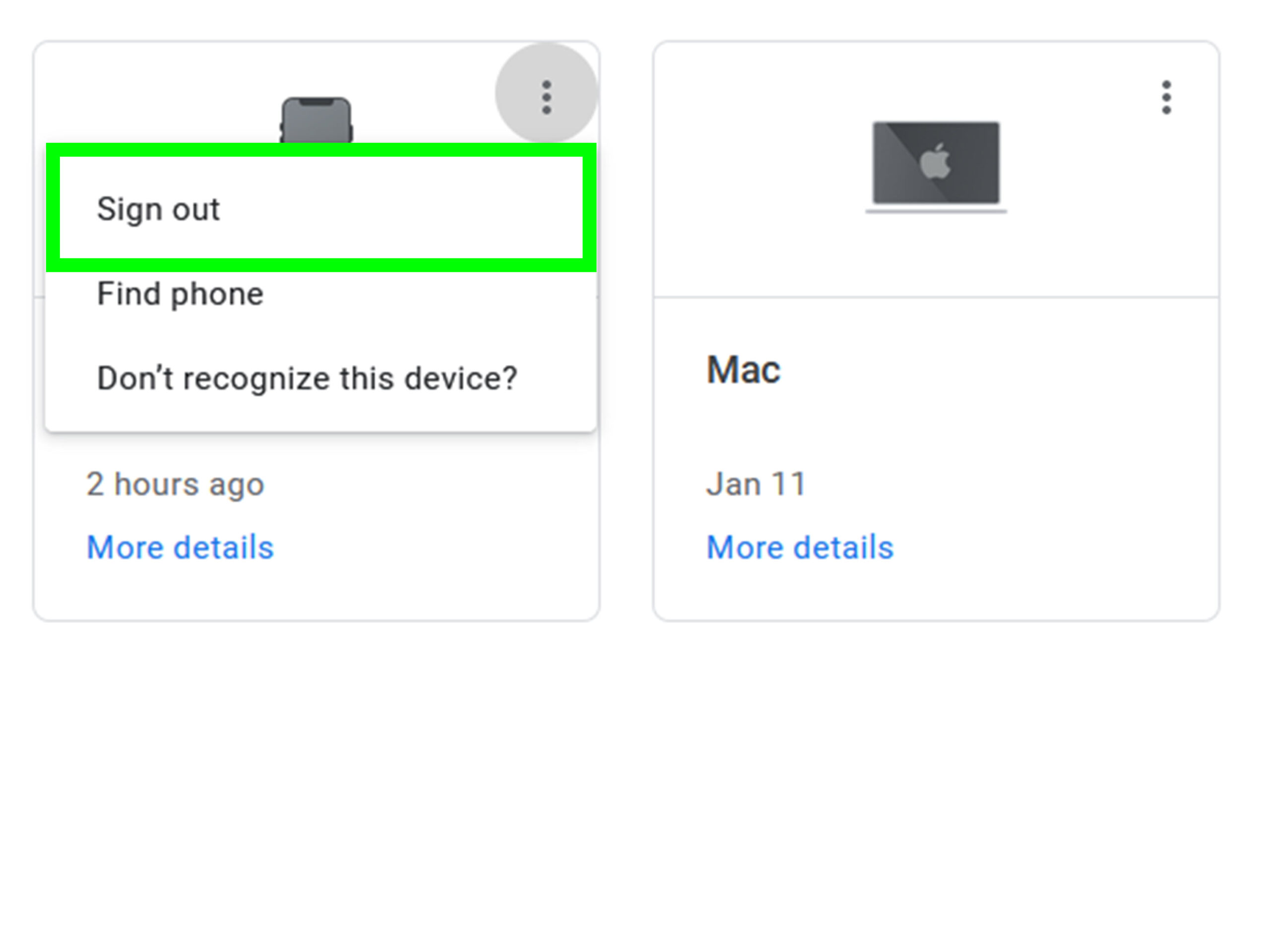 If you don’t want to find out more information about a signed-in device and just want to sign out quickly, click the three dots at the top of any device in this list, select Sign Out, and then confirm. Repeat for all devices in the list.