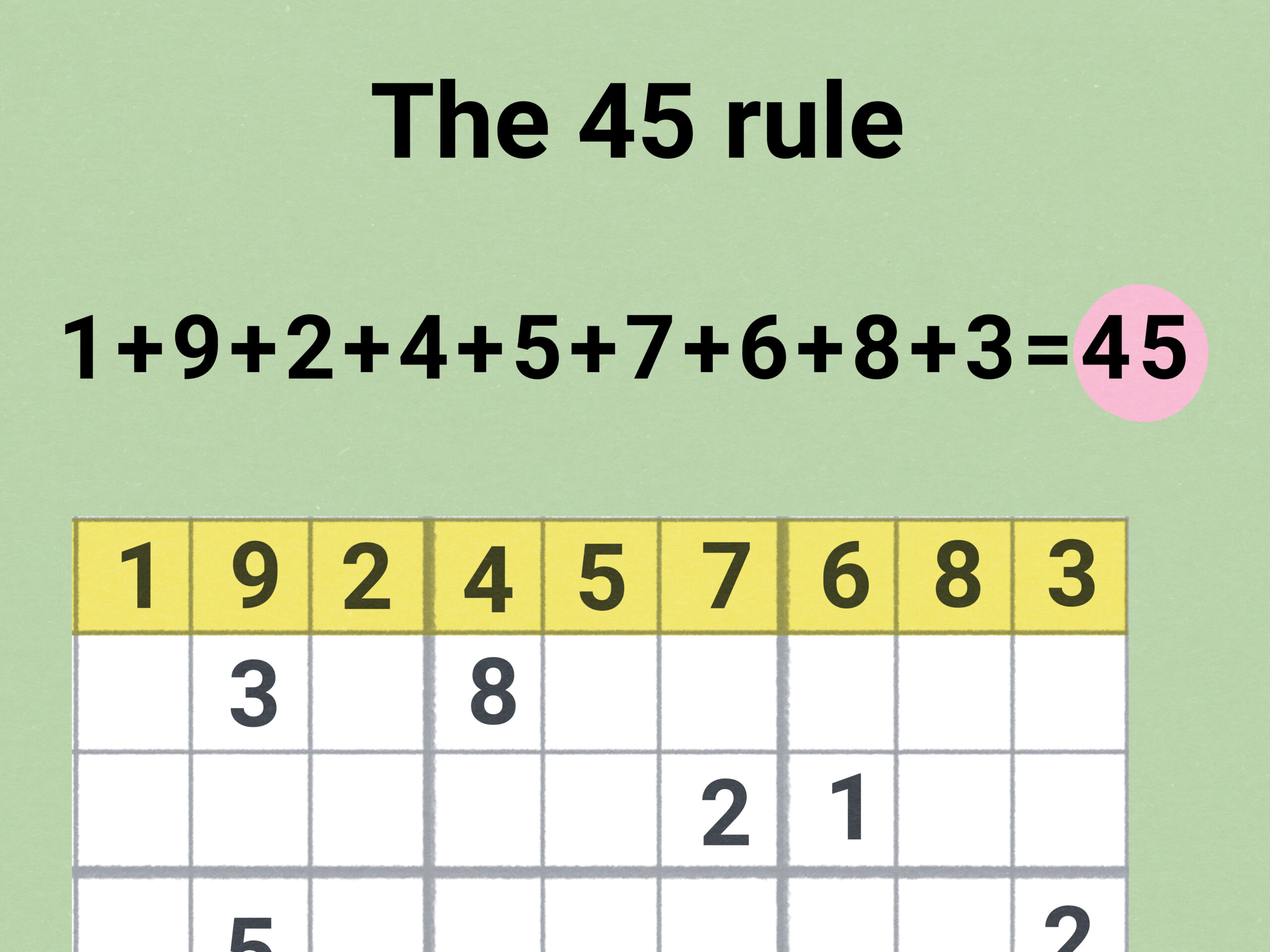 {“smallUrl”:”https://www.wikihow.com/images/thumb/9/9b/Solve-Hard-Sudoku-Puzzles-Step-13.jpg/v4-460px-Solve-Hard-Sudoku-Puzzles-Step-13.jpg”,”bigUrl”:”/images/thumb/9/9b/Solve-Hard-Sudoku-Puzzles-Step-13.jpg/aid12771118-v4-728px-Solve-Hard-Sudoku-Puzzles-Step-13.jpg”,”smallWidth”:460,”smallHeight”:345,”bigWidth”:728,”bigHeight”:546,”licensing”:”<div class=”mw-parser-output”><p>u00a9 2023 wikiHow, Inc. All rights reserved. wikiHow, Inc. is the copyright holder of this image under U.S. and international copyright laws. This image is <b>not</b> licensed under the Creative Commons license applied to text content and some other images posted to the wikiHow website. This image may not be used by other entities without the express written consent of wikiHow, Inc.<br>n</p><p><br />n</p></div>”}If you solve a row, column, or cell, use the 45 rule to confirm the solution. If you solve a part of the puzzle but you simply can’t find an answer to another part of the puzzle and it seems impossible, check your work. Any solved row, column, or cell should add up to 45. If you made a mistake and doubled-up your answers somewhere, it will keep you from solving other portions of the puzzle, so check your work![18]