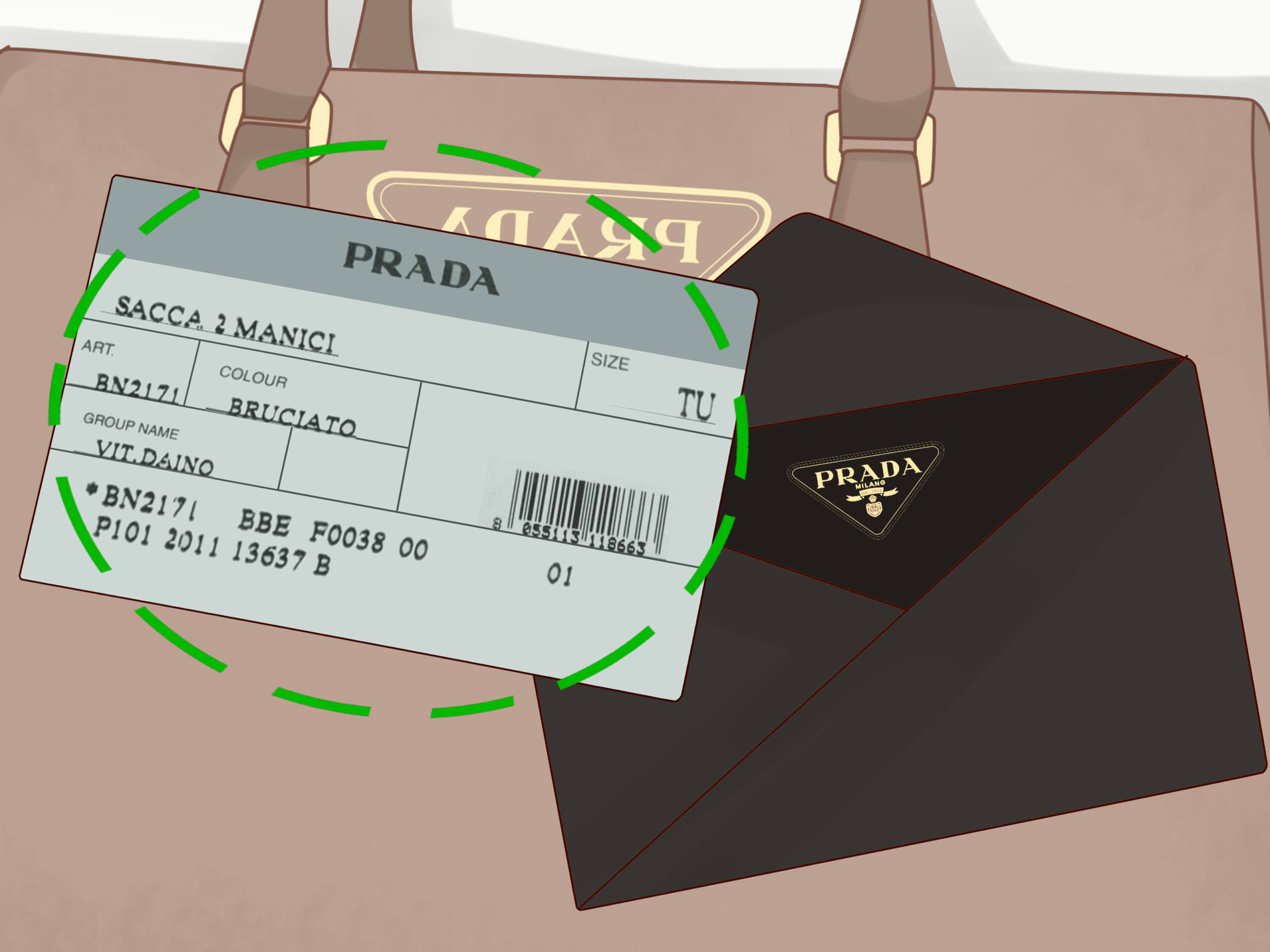 There should be a label stitched in the dustbag that says “Prada” and “100% Cotton Made in Italy”.
