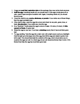 If eggs are being consumed by high-risk individuals (the very young or elderly), you may want to only use eggs at their peak freshness. While eggs are generally just fine for weeks after their expiration date, you may want to take extra precautions when feeding those with lowered immune systems and stick to just the freshest eggs.⧼thumbs_response⧽