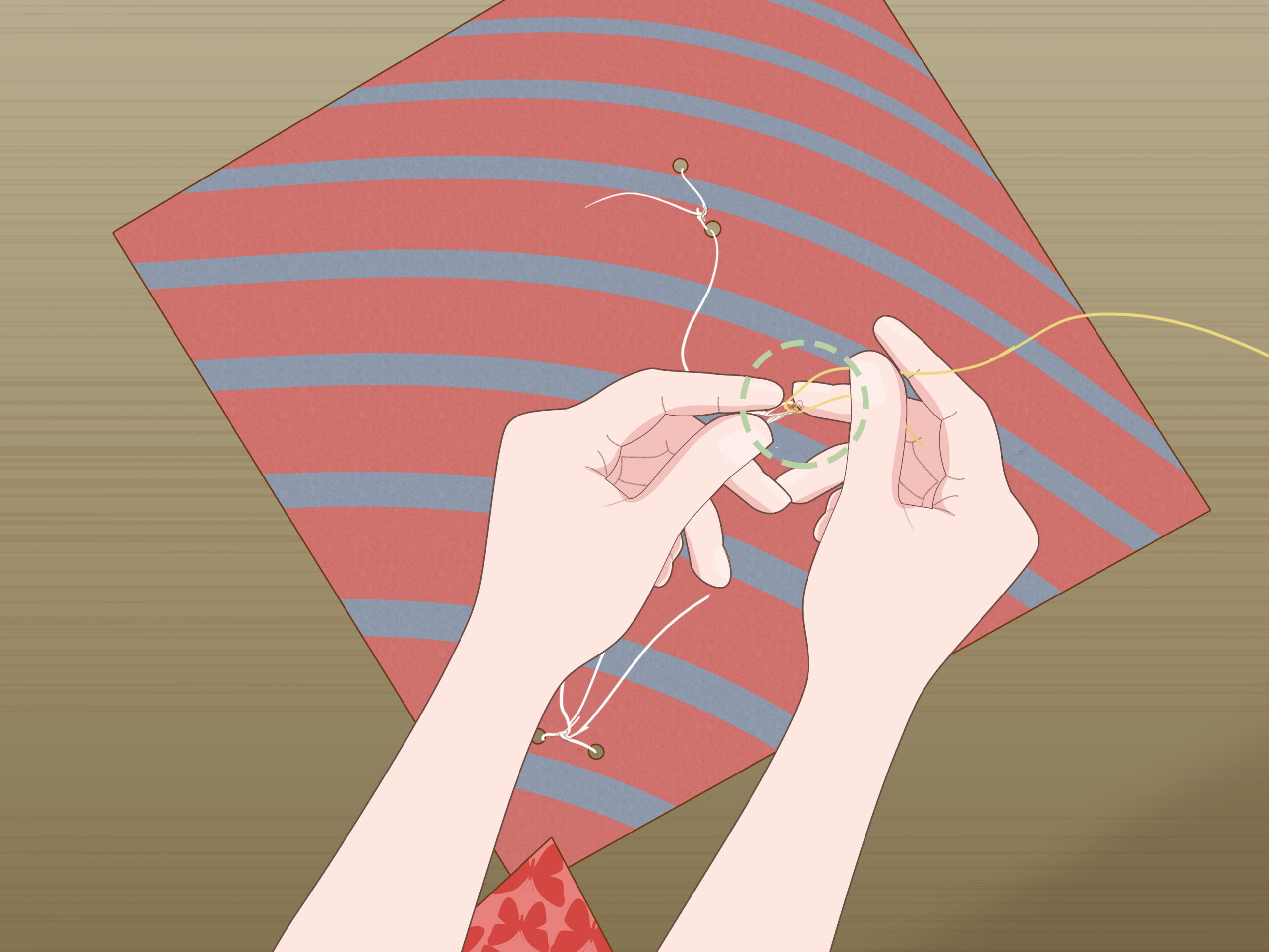 Insert the thread into the top hole and back through the hole below. Place the folded end of the thread about 5 centimetres (2.0 in) through the top hole via the front of the kite. Then, pull the thread back toward yourself via the diagonally opposite hole. [4] X Research source
