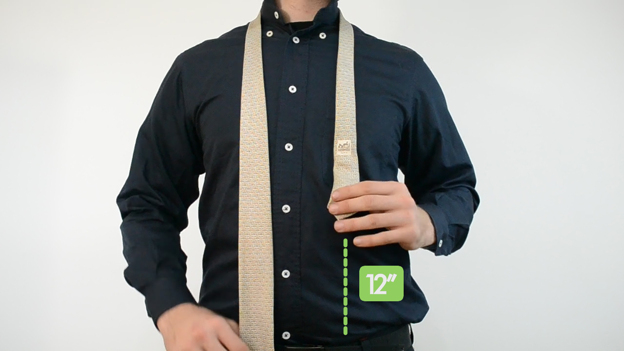 - The narrow end of the tie should be higher than the wide end. It will usually be around belly button level, but this is less important than the wide end’s placement.[9]
