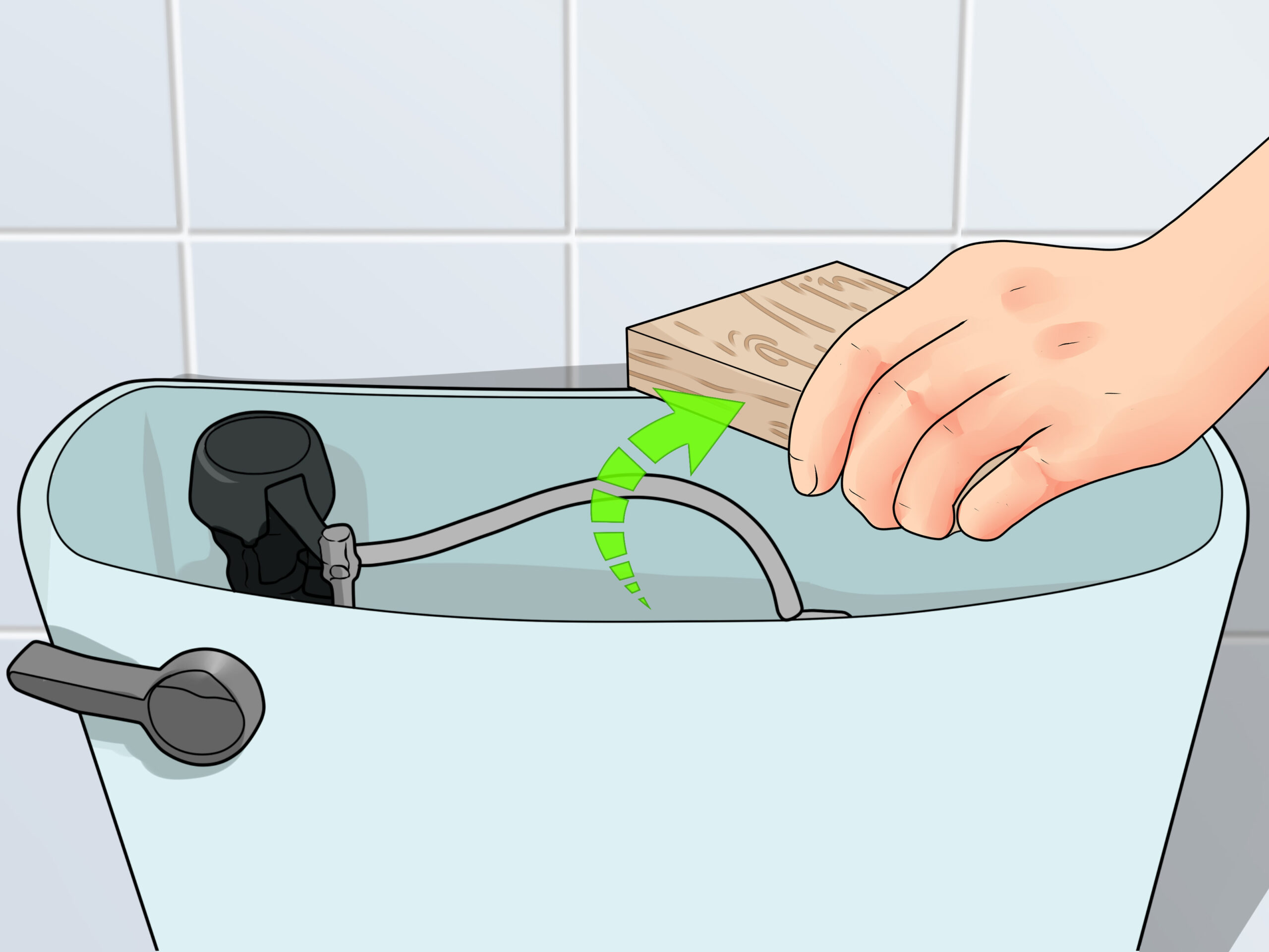 - If the sides of the tank are too high to do this, then straddle the board above the float lever and wrap a length of stiff wire around both the float arm and the board to hold the float up.