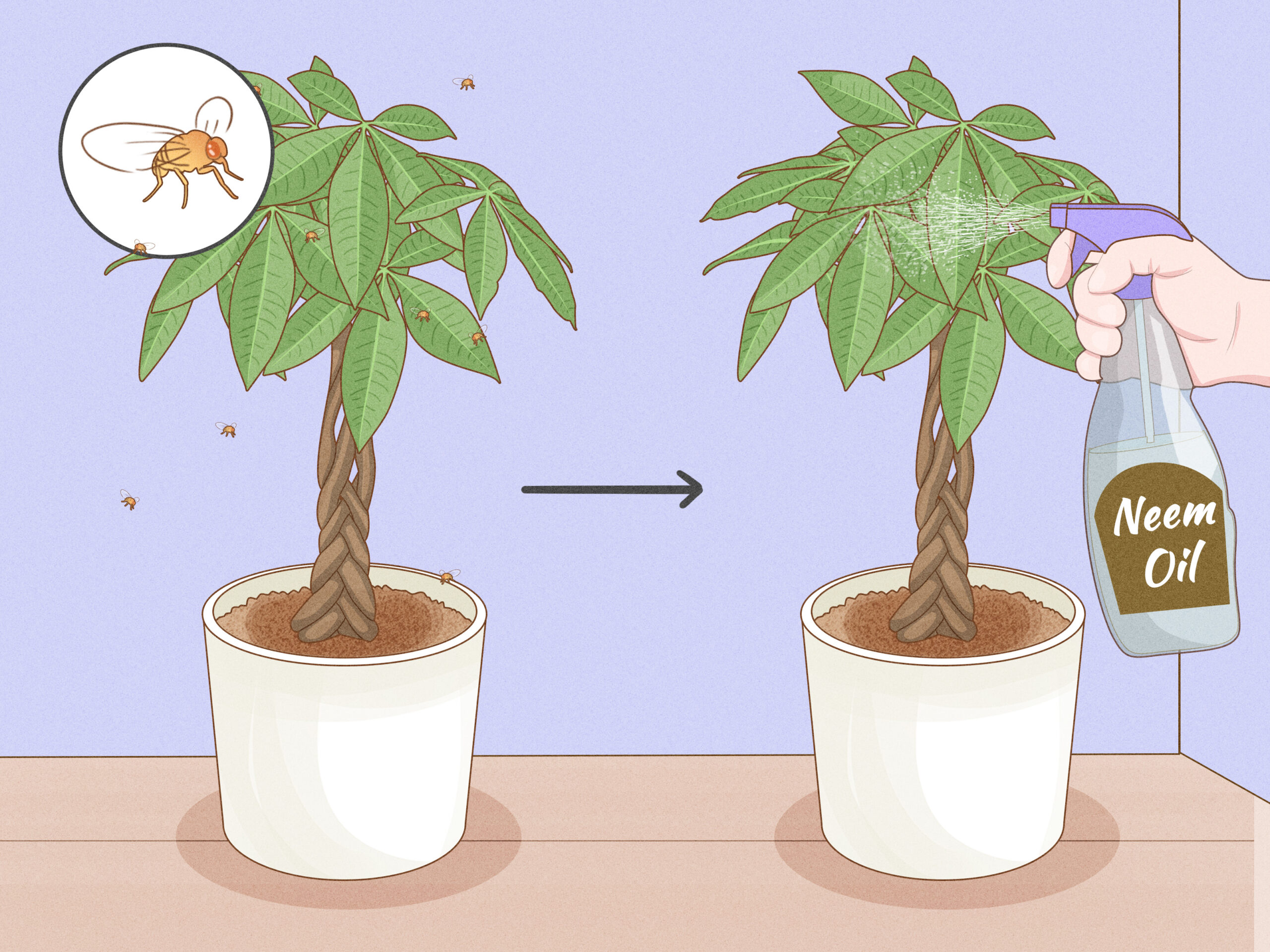 If you spot pests, simply spray your money tree with neem oil (or any insecticidal soap) daily until the bugs are gone.[18] X