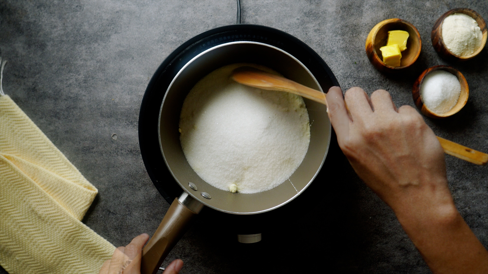 1Combine the condensed milk, powdered milk, and sugar in a saucepan. Make sure to stir the ingredients thoroughly as you heat them until they turn to a paste. -