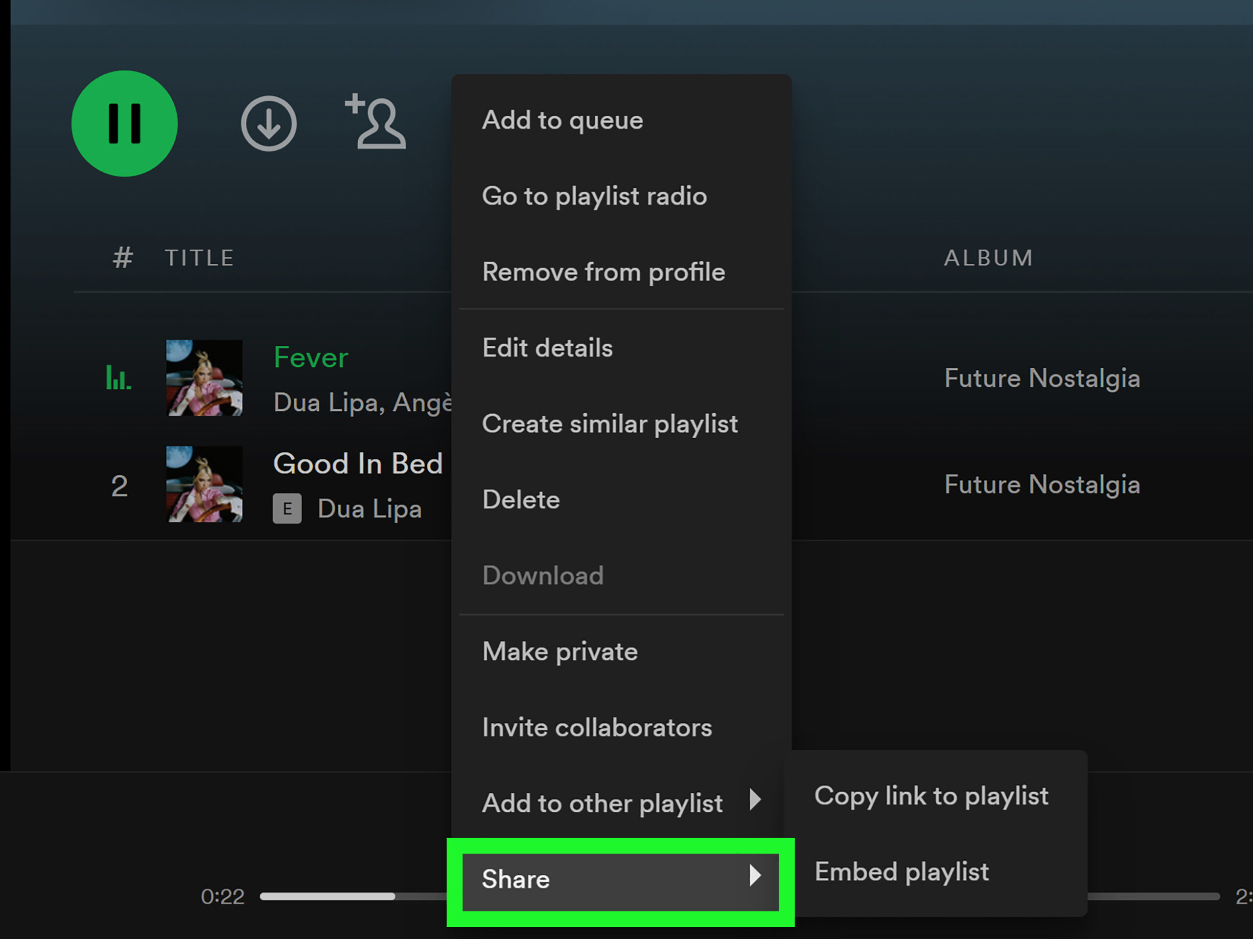 You can also click or tap Copy link (on mobile) or Copy link to playlist (on a computer) to copy the playlist’s URL to your clipboard so you can paste it anywhere.