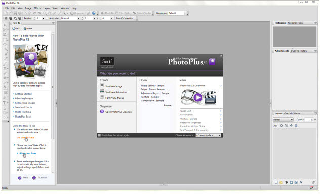 Toolbars stretch across the top and down the left side, and an info/control panel graces the right side of the program’s window. At first run, a How To panel also appeared next to the left edge panel. This offered basic training like Adjusting Images, Retouching Images, and Creative Effects.