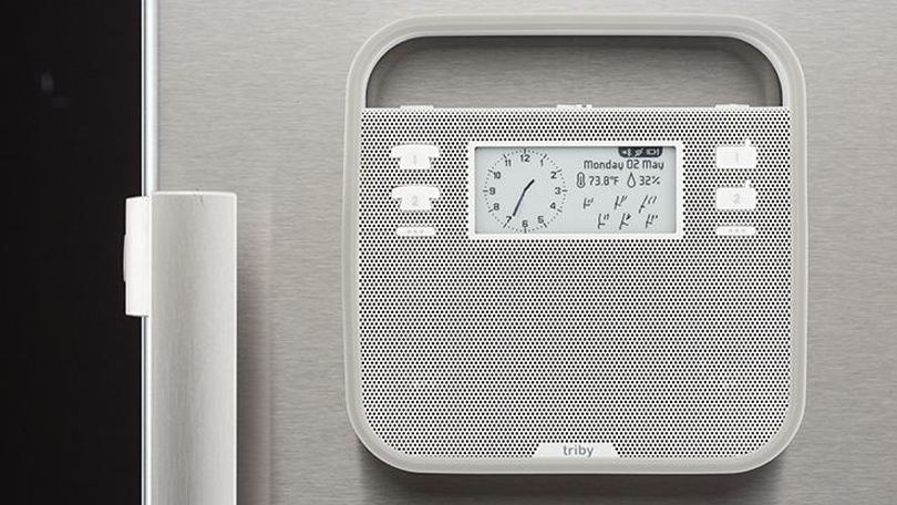The front of the speaker is dominated by the metal grille, with two Call buttons and one extra button in a column on the left, and two Radio buttons and one additional button on the right. A rectangular 2.8-inch E Ink display sits between the two columns. By default it shows the date and time, as well as the temperature and humidity (based on internal sensors). It also shows the current audio source if playing music, and will display any message a user sends to the device from the Triby app.